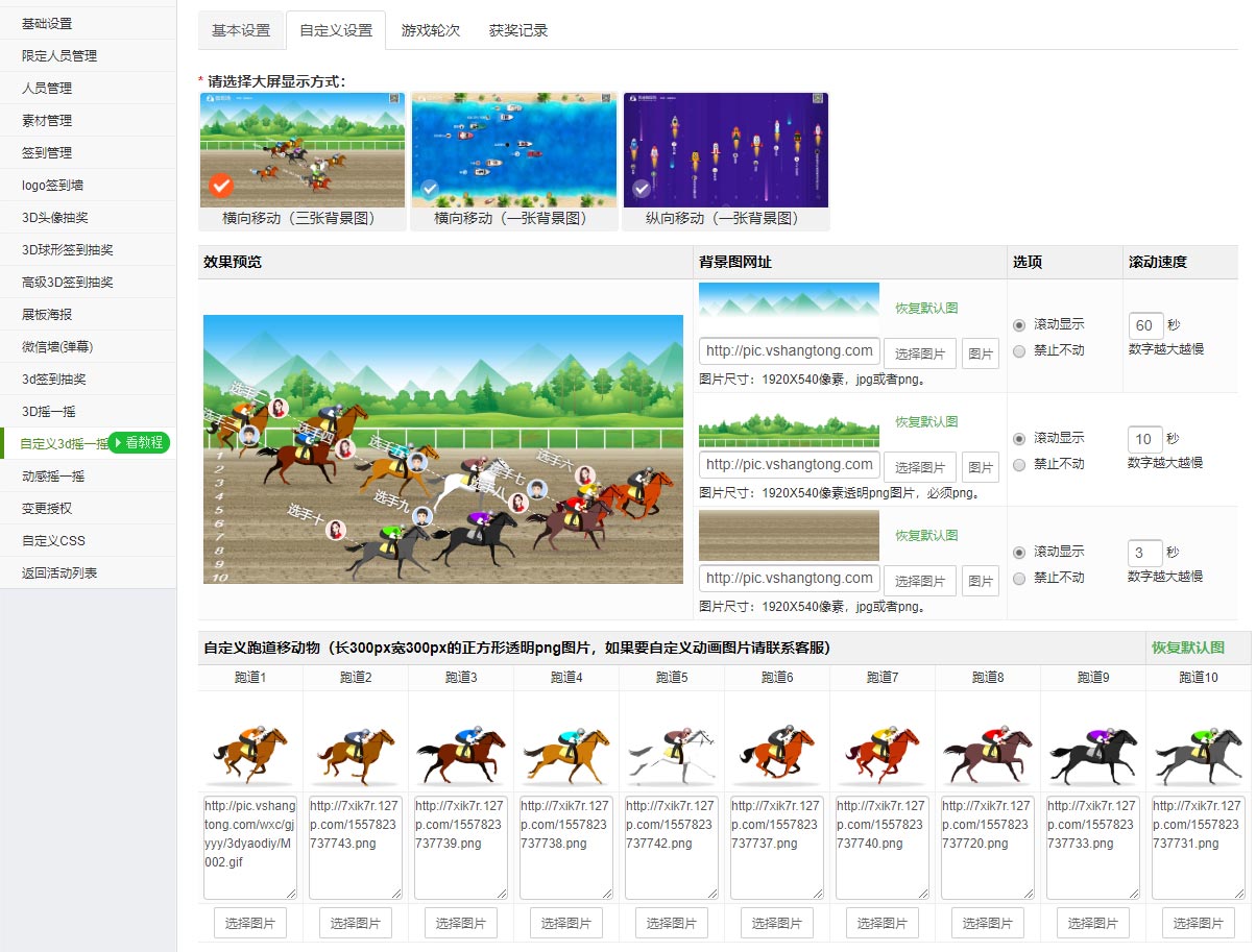 自定义3D摇一摇,可以后台自定义大屏展示的卡通形象,自定义背景图片,还能设置横板还是竖版游戏。