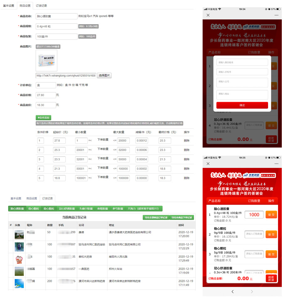 手机微信扫码,输入姓名,手机号,公司名称,地址,参与订购会,手机页面可以看到商品的名称,规格,实时单价和自己的订购总金额。可随时输入和修改订单量,系统自动同步到大屏幕。不支持线上支付,只是作为订单统计工具!