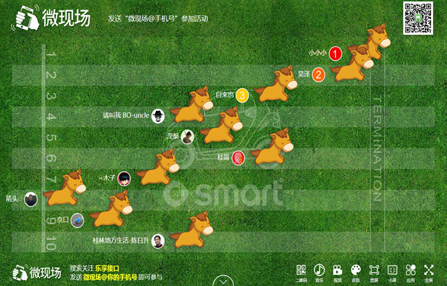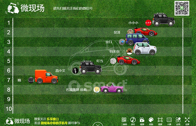 先设置要轮次,然后打开跑马大屏幕,参与者扫码进入摇一摇手机页面,大家进入后,主持人再点击大屏幕的开始按钮, 大家开始疯狂摇手机,大屏幕显示前10名用户头像昵称,活动结束显示排行榜(后台设置几个人中奖就显示几个人)。