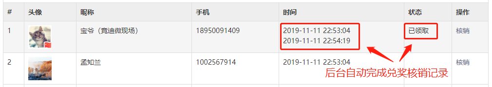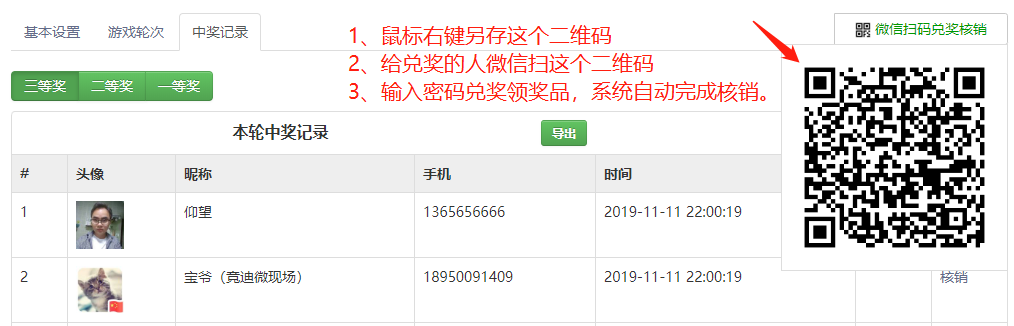 高级抽奖功能有兑奖核销二维码,在中奖记录里面,可以打印出来供兑奖使用。